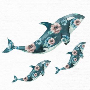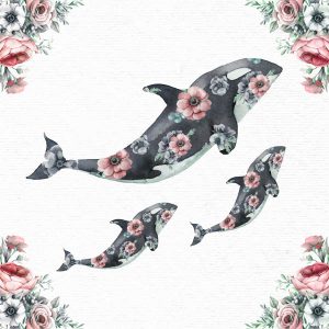 Watercolor Whales with Flowers