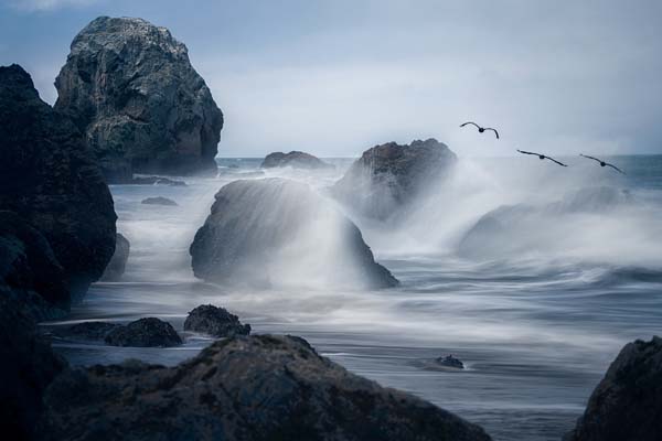 Lee – Seabirds over Rocky Shore in Ocean Spray